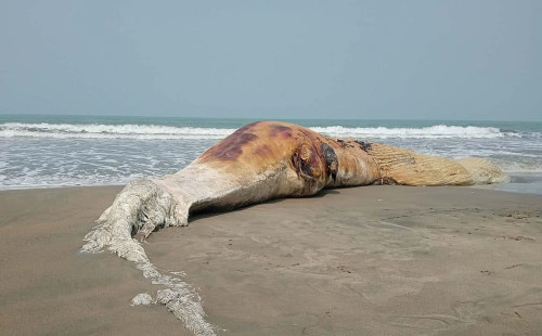 Dead whale washes ashore in Kutubdia, stench spreads despite being buried