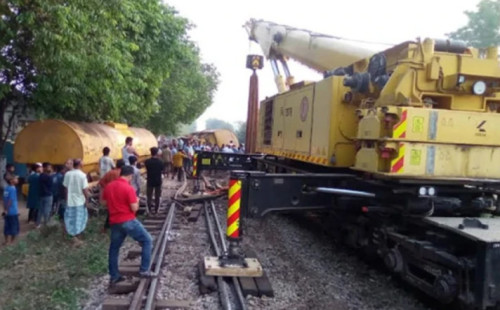 কাছে সিলেটগামী তেলবাহী ট্রেন লাইনচ্যুত হওয়ার পর এ পথে ১৬ ঘণ্টা ধরে বন্ধ রয়েছে