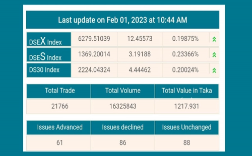 এদিন শেয়ারবাজারে লেনদেন শুরু হয় বেশিরভাগ প্রতিষ্ঠানের শেয়ার দাম বাড়ার মাধ্যমে। ফলে লেনদেন শুরু হতেই ডিএসই’র প্রধান সূচক ৪ পয়েন্ট বেড়ে যায়। লেনদেনের শুরুতে দেখা দেওয়া এই ঊর্ধ্বমুখী প্রবণতা প্রথম আধাঘণ্টাজুড়েই অব্যাহত রয়েছে।