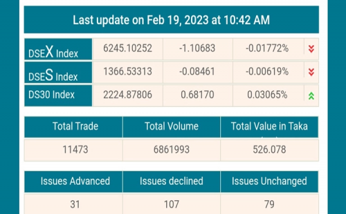 এ প্রতিবেদন লেখা পর্যন্ত ১০টা ৪২ মিনিটে ডিএসইতে ৩১টি প্রতিষ্ঠানের শেয়ার ও ইউনিট দাম বাড়ার তালিকায় নাম লিখিয়েছে। বিপরীতে দাম কমেছে ১০৭টির। আর ৭৯টির দাম অপরিবর্তিত রয়েছে।